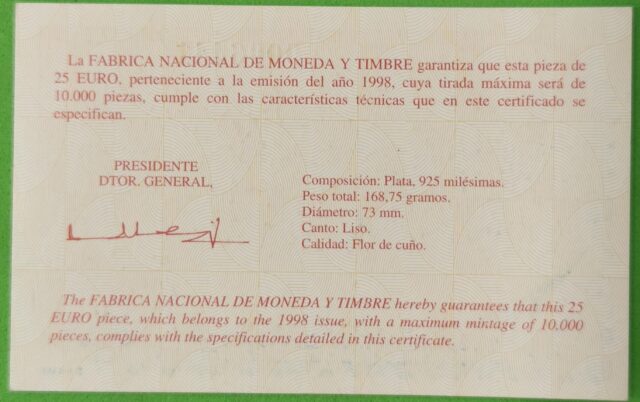Inicio MONEDAS CONTEMPORÁNEO AÑO 1998. 25 EUROS PLATA EMBLEMAS. PESO 168,75 GR