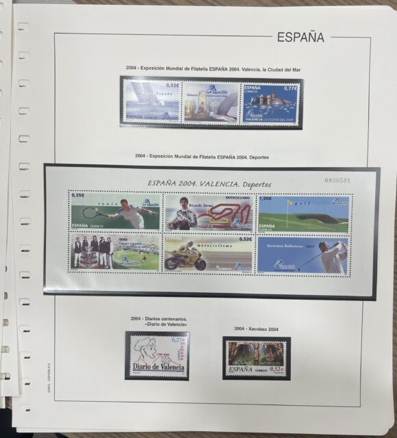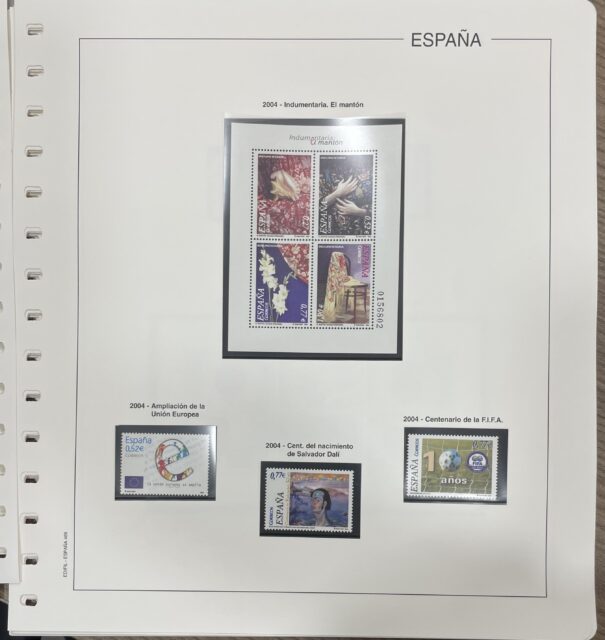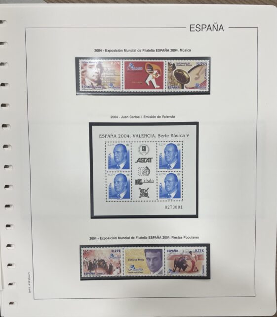 COLECCIÓN DE SELLOS, HOJAS BLOQUES Y CARNETS (A FALTA DEL PRODUCTO ESPECIAL EXPOSICIÓN MUNDIAL DE FILATELIA ESPAÑA 2004), NUEVOS SIN SEÑAL DE FIJASELLOS MONTADO EN HOJAS EDIFIL CON ESTUCHES EN NEGRO