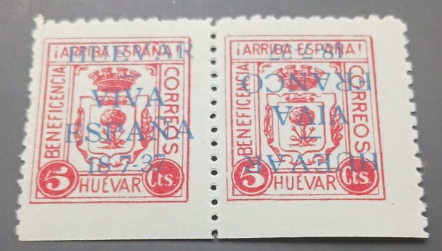 HUEVAR ( SEVILLA ) EDIFIL 134 * 5 CTS ROJO PAREJA HORIZONTAL SOBRECARGADA.
